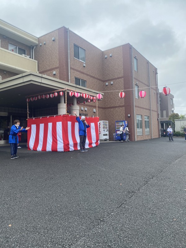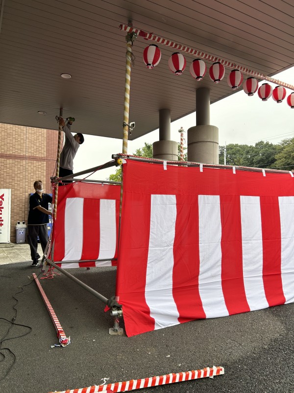 櫓は前日に組む予定でしたが雨のため、当日7時過ぎから男性職員3人が黙々と作業をしてくれました。
