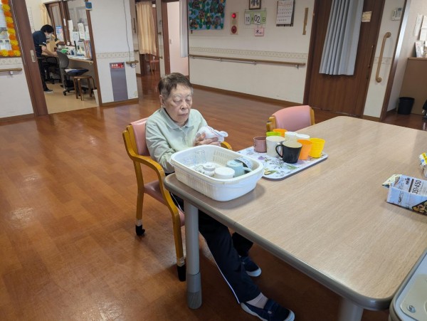 ある日の朝食後、1人の利用者様が「何か仕事ありますか?何もやることがなくて…」と職員の側にやってきました。ちょうど食器洗いが終ったところだったのでお願いすると、快く引き受けて下さいました。