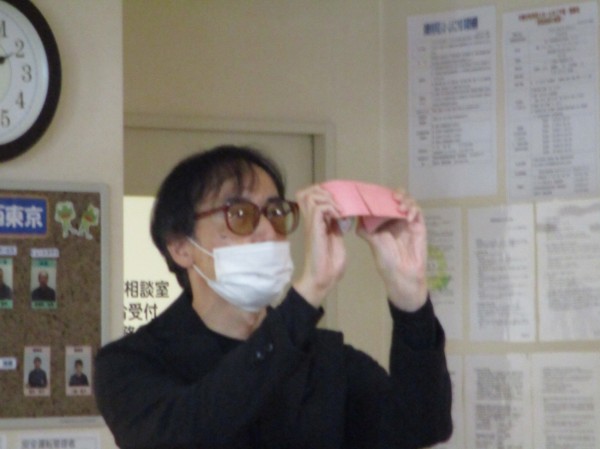 次は紐を使った手品!紐を輪っかに通し・・・。お洒落なハンカチが出てきました???