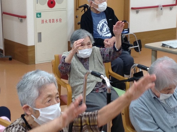 曲を流しながら楽しく運動を続けていきます。皆様しっかり付いて行っています