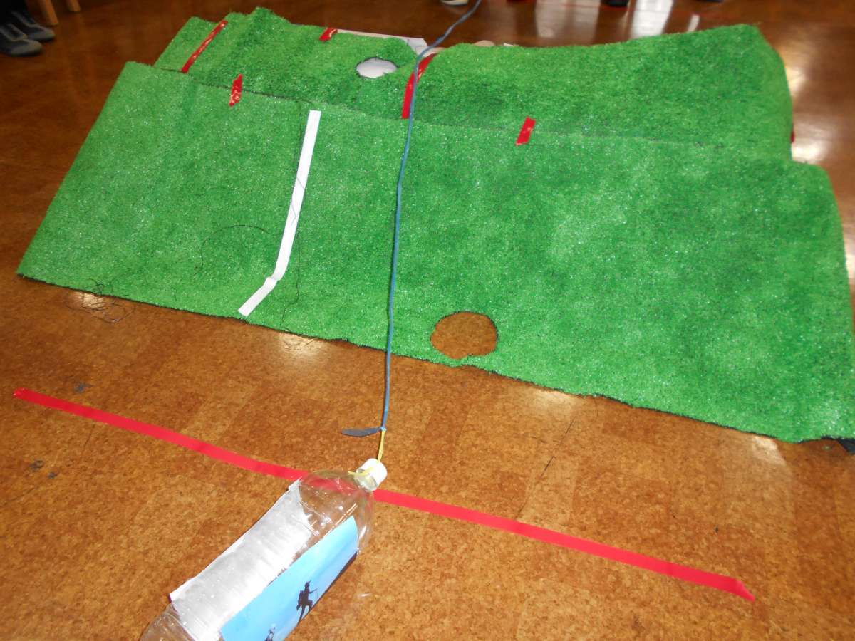 ペットボトルから長い紐が伸びていて
