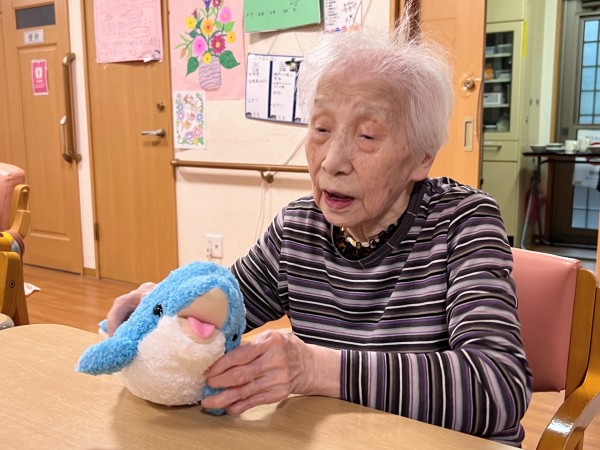 音が鳴るイルカのお人形さんを可愛いがられている○○様。