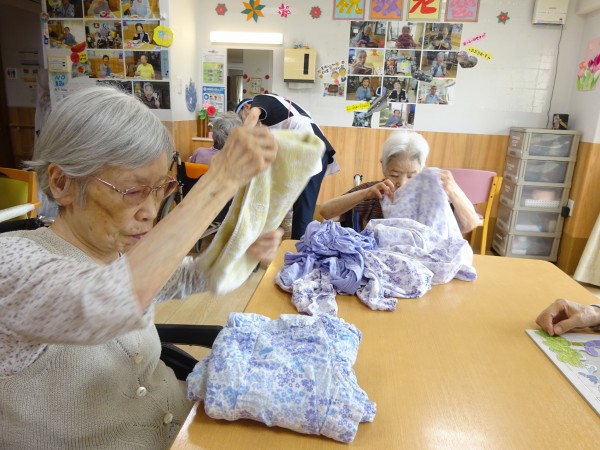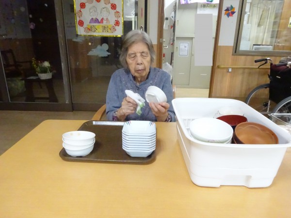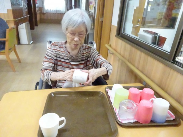 食後の食器拭き、お茶やおやつの後のコップ拭き、タオルたたみ、新聞紙たたみなどなど、、、