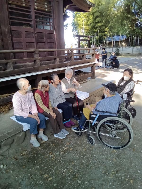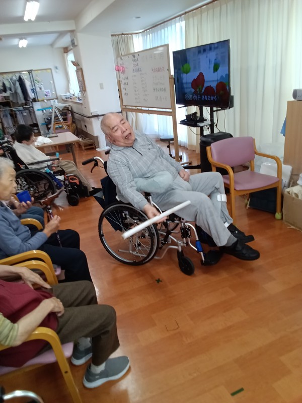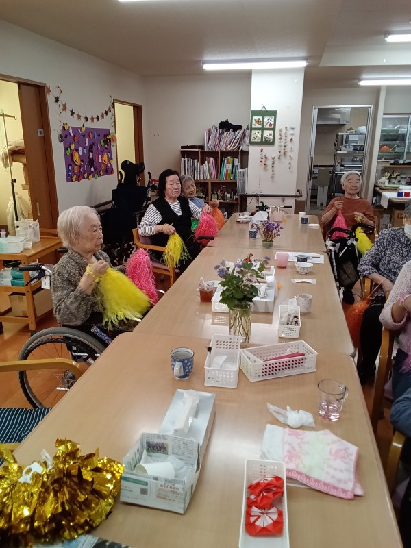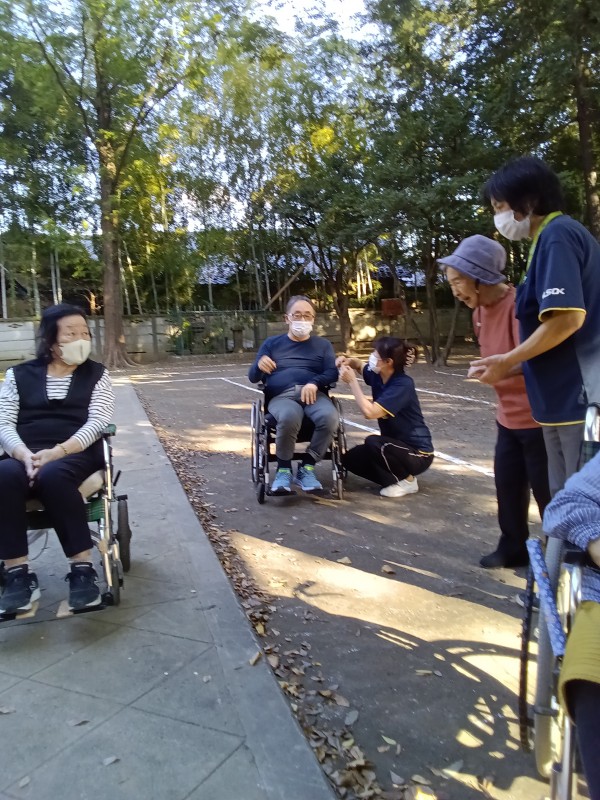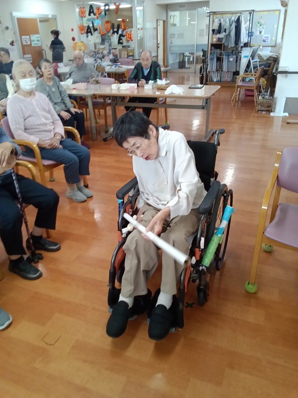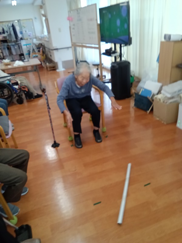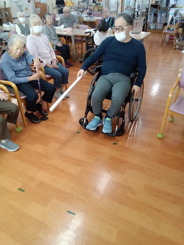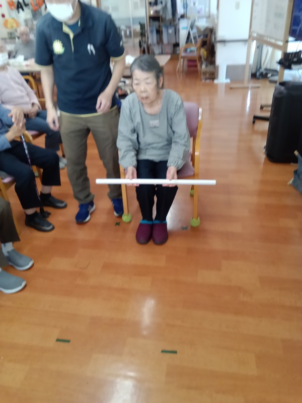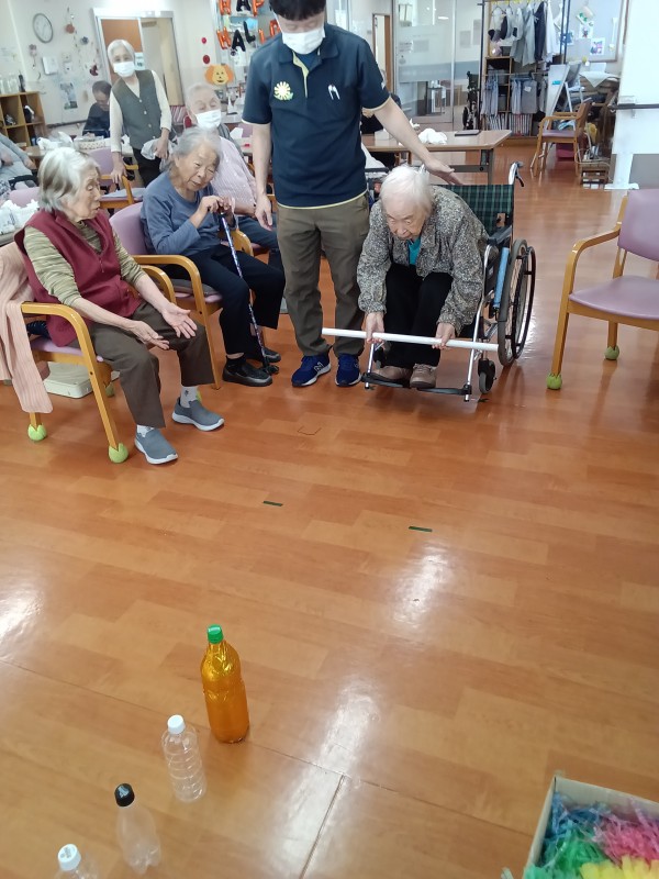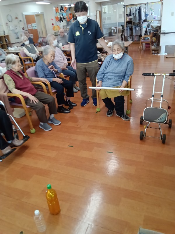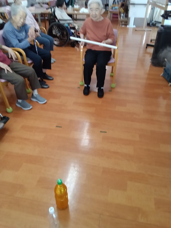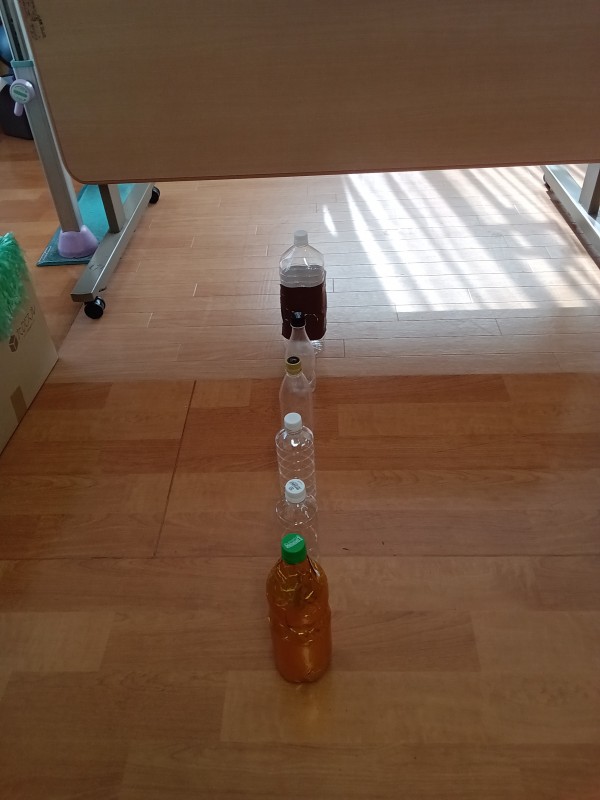 ペットボトルを縦に並べて、棒を転がして倒した本数で勝敗を決めています。