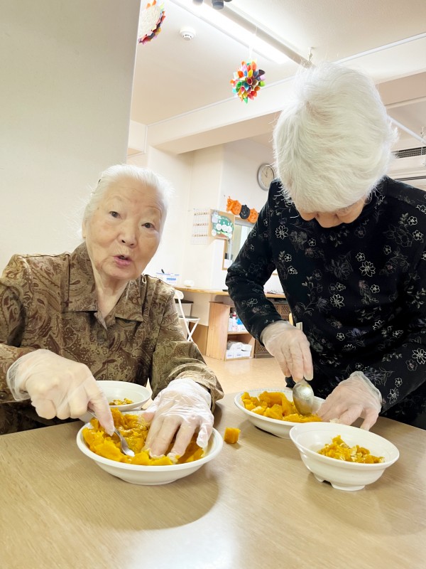 グループホームみんなの家大宮三橋 3階10月誕生会は旬のかぼちゃでトロッと美味しいかぼちゃプリンを手作りしてお祝いしました!