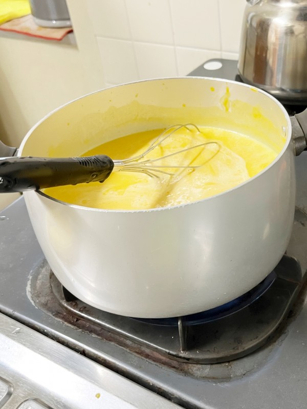 お鍋に入れてふやかしたゼラチンを加え火にかけて混ぜます。
