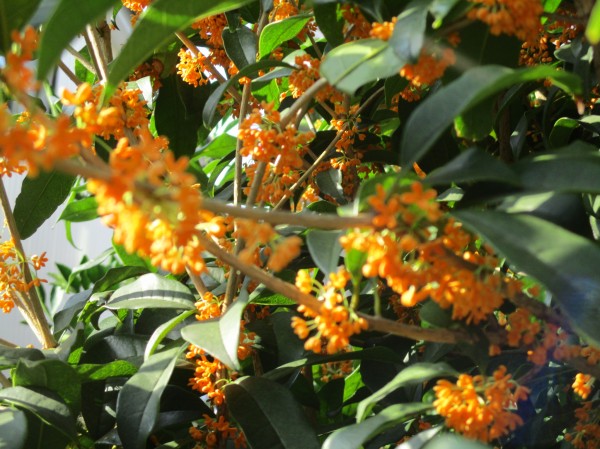 気分転換も兼ねて外へ出て見ると、駐車場の脇にオレンジ色が眩しいキンモクセイが、そのいい香りを漂わせていました。