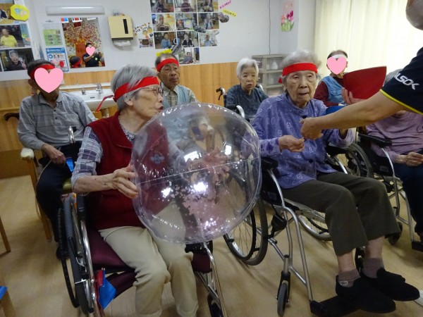 大きなキラキラのビーチボールを隣に渡してリレーしています