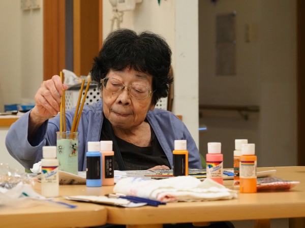 職員が用意した小さな板に、絵具で色を塗っていきます。(^^♪