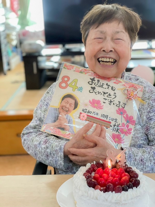 職員からケーキと誕生日色紙のプレゼント!皆さんからは歌のプレゼント!を頂き
