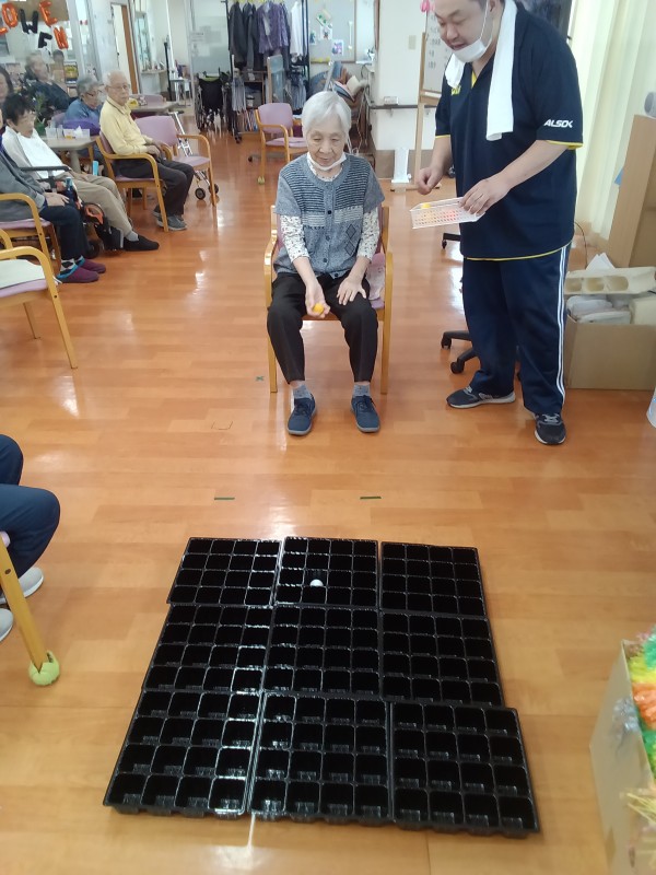 1人10球ピンポンを奥の黒い枠に入れていきます。