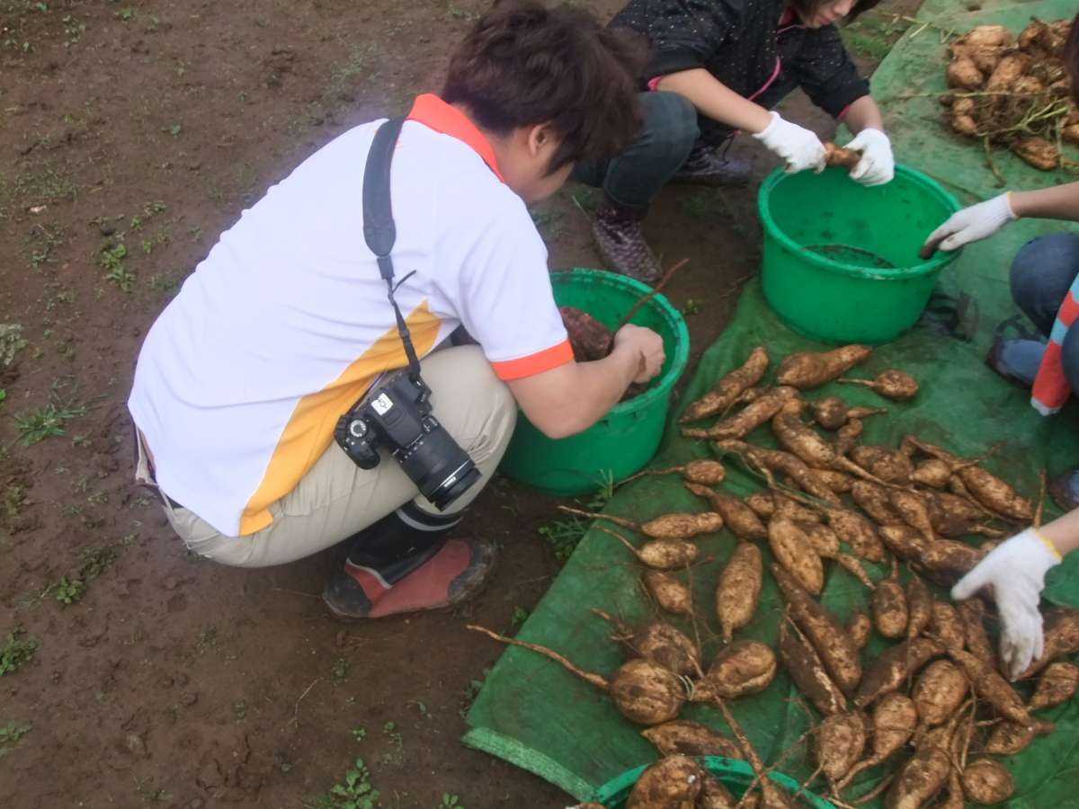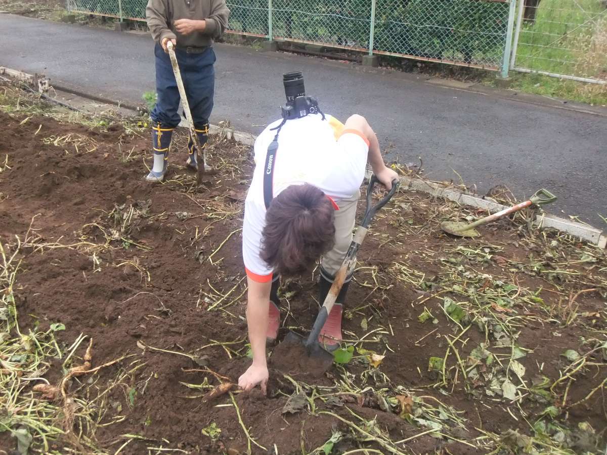 さて、芋掘りの様子ですが、昨晩振っていた雨のせいで(去年も雨が降っていた様な(笑))長靴に土はくっつくは、スコップにも土がつき、大変でした