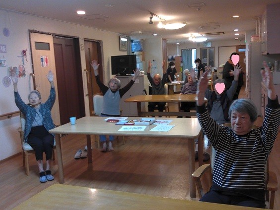 日課の体操では、「体操は朝やるんだよ」といいながらも
