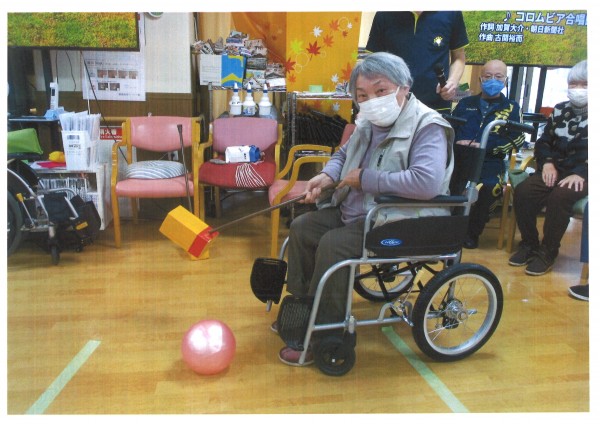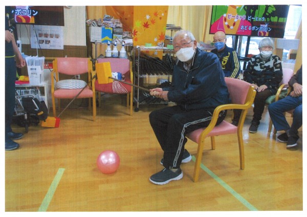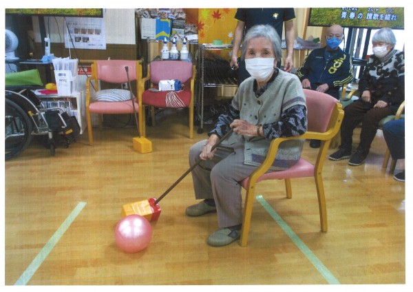 本日午後のレクリエーションは【ホールでゴルフ】職員お手製のクラブで大きなボールを打つ誰でも簡単にできるゴルフです。床に貼ってある点数のところにボールが止まれば得点になります。クラブは軽く作られていて皆様に楽しんでいただけるゲームになっています。パワーのある方は加減しないとOBになってしまいますのでご注意くださいね。