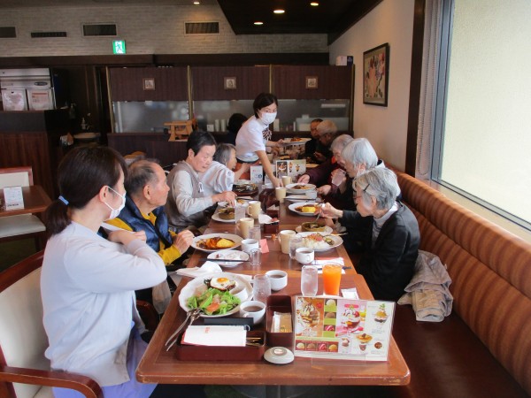 本日のお昼は【外食会】です。事前に申し込まれた方だけの外食会。今回はロイヤルホストさんです。コロナでずっとお休みしていた外食会。毎月お弁当を頼んでいましたが、出来立ての温かいお食事もいいよね~ということで復活しました。人気だったのはハンバーグランチ。お肉がお好きな方は元気な方が多いと聞きますが、まさにその通りだと納得いたしました。皆様、もりもりと完食されいい笑顔を見せてくださいました。事故なく安全に外出することができ、本当に良かったです。次回の外食会も楽しみですね♪