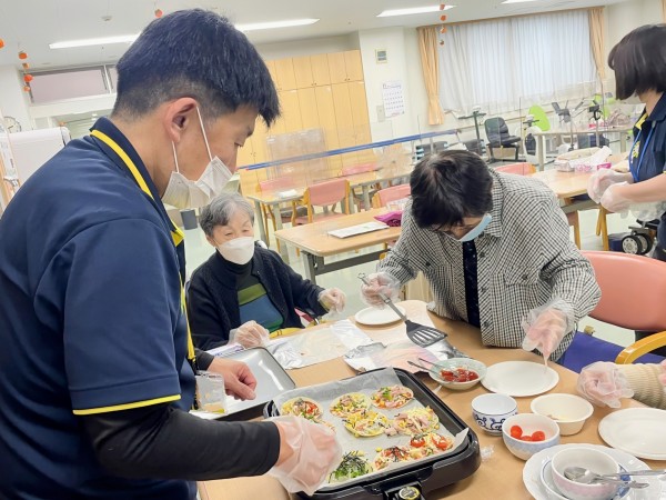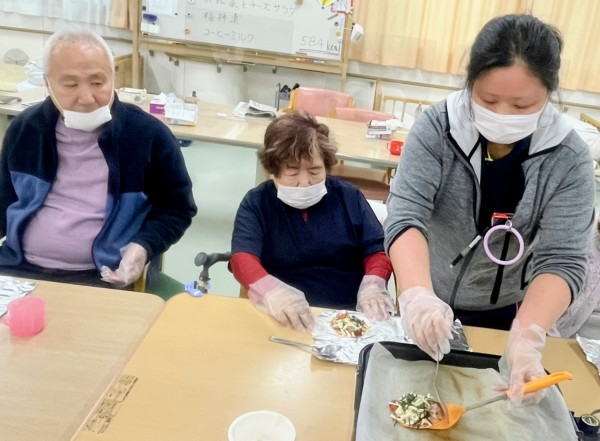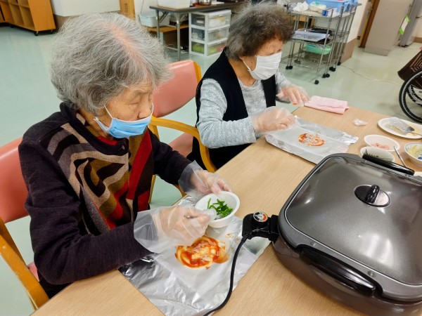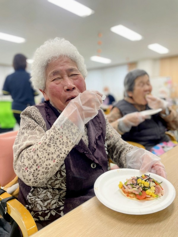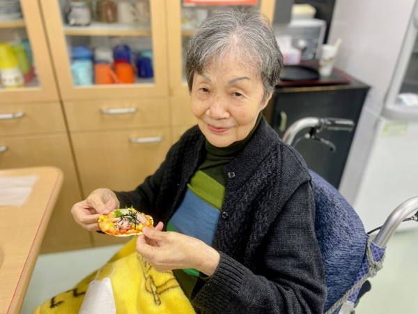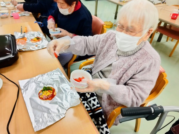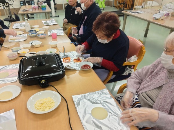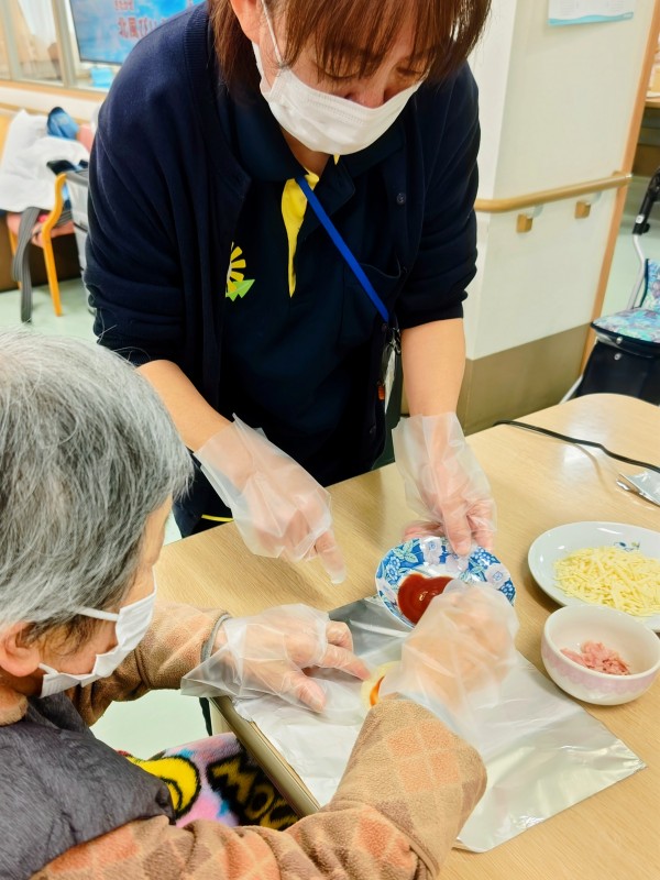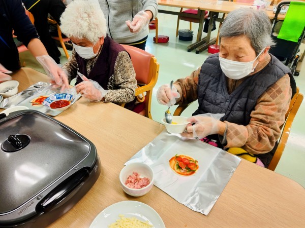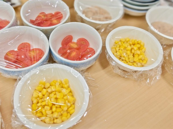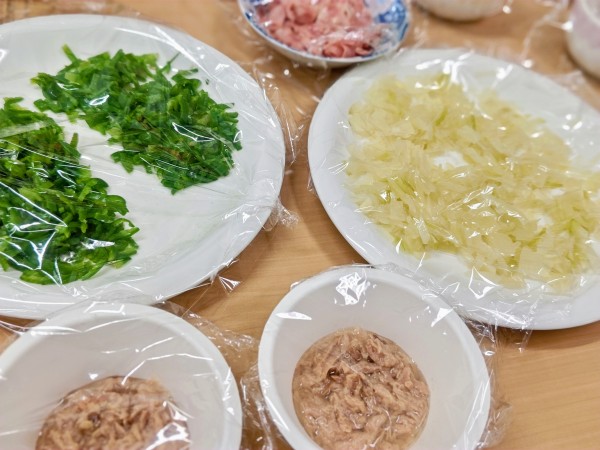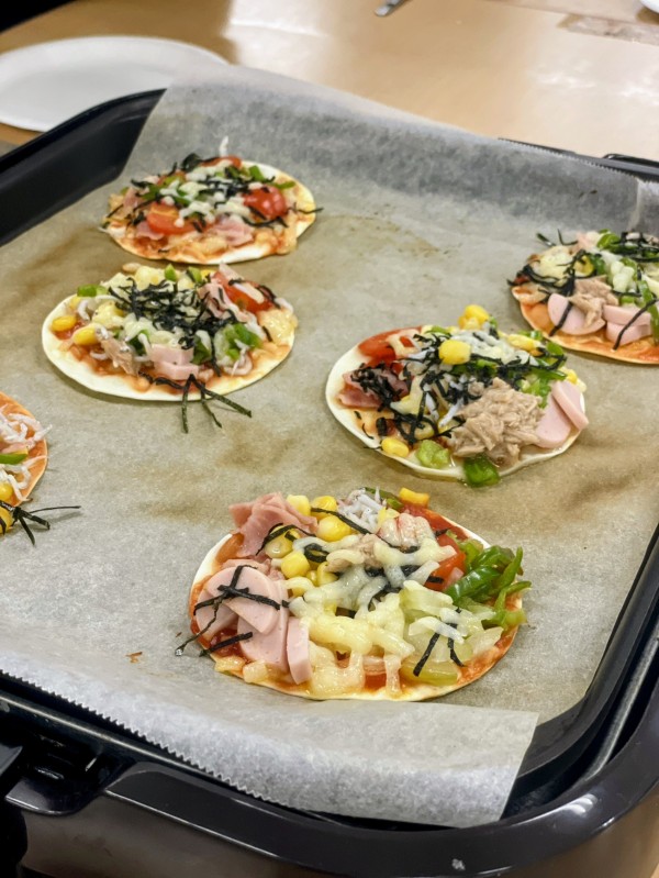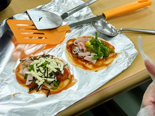 皆さんには餃子の皮にケチャップをぬって、好みの具材をのせていっていただきました!