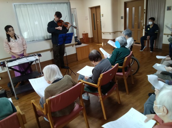 ご利用者様や職員達が見惚れてしまいそうなとても素敵なバイオリンの音色ととても綺麗な歌声でした。
