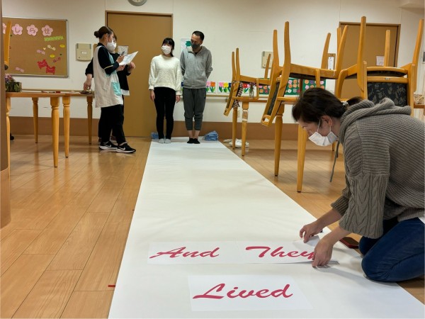 長い模造紙をバージンロードに見立て、幸せになる英語の文章を印刷したものを貼りました