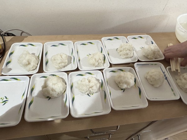 もち米とお米を混ぜて炊き、もち米とお米を練っていきました。
