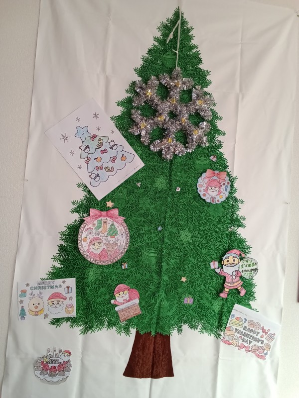 午後のレクの時間に塗っていただいた塗り絵はオーナメントになりました!