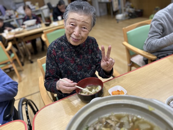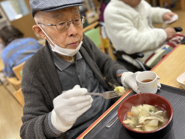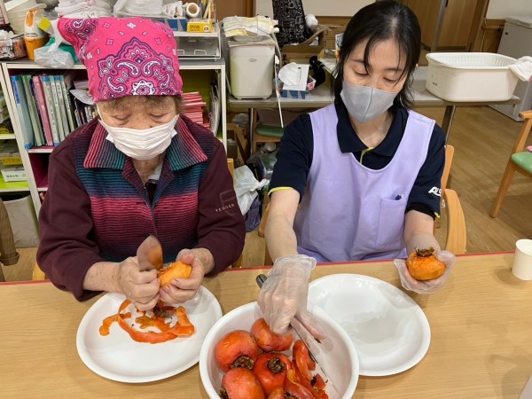 待っている間に、ご利用者様と一緒にデザートの柿を剥いて