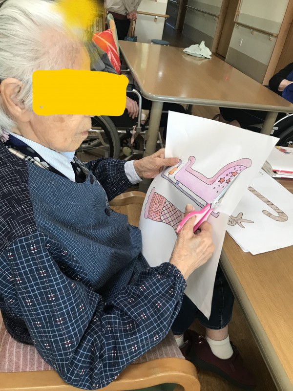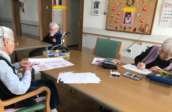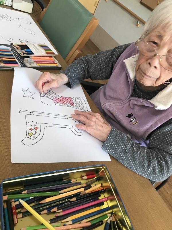 今日はクリスマスの絵に塗り絵が得意な方々に色塗りをしてもらいました♪