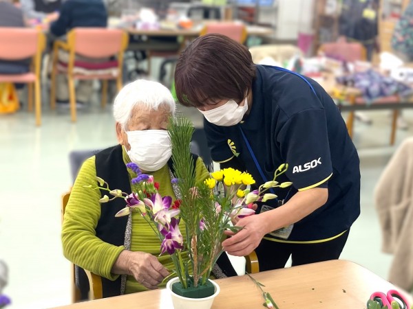すべての花材をさして、バランスを整えたら最後に水引飾りを飾って