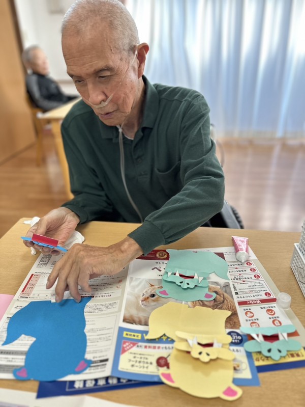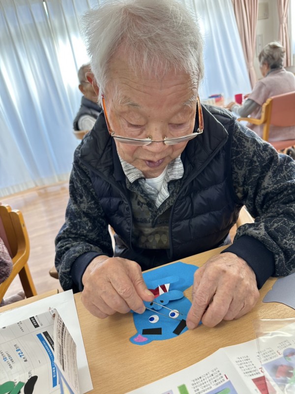 型紙を使って、色画用紙・毛糸・丸シールなどを使って『新春の狛犬』を作って頂きました。