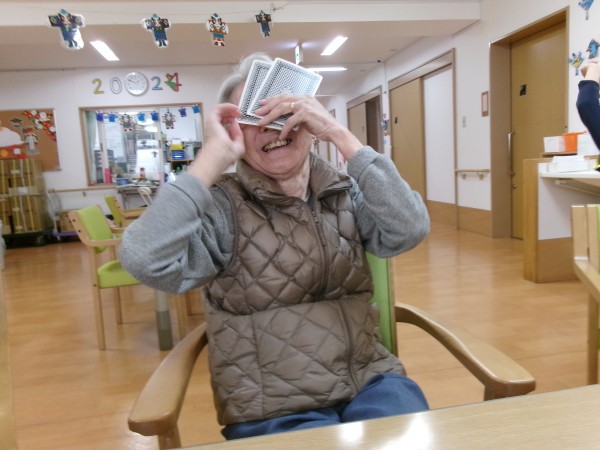 最初に、でかいトランプを使ってババ抜きを始めました。皆さん、カードを選ぶときにワクワクした表情を見せ、自然と笑顔が広がります。時々、ババを持ってしまった方もいましたが、笑い声が絶えず、とても楽しい雰囲気でした。