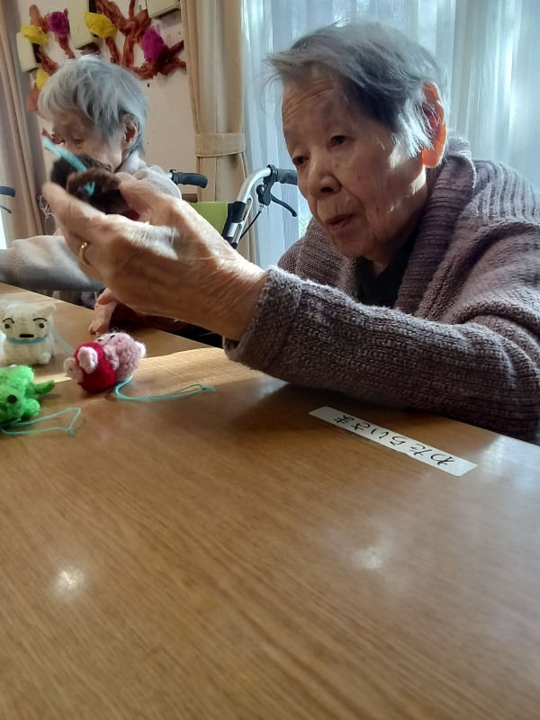スタッフが手作りした小さな縫いぐるみを入居者様に見てもらった様子です