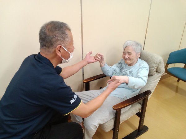 フロアの隅で、スタッフと手遊びをされているご入居者様がいらっしゃいました!