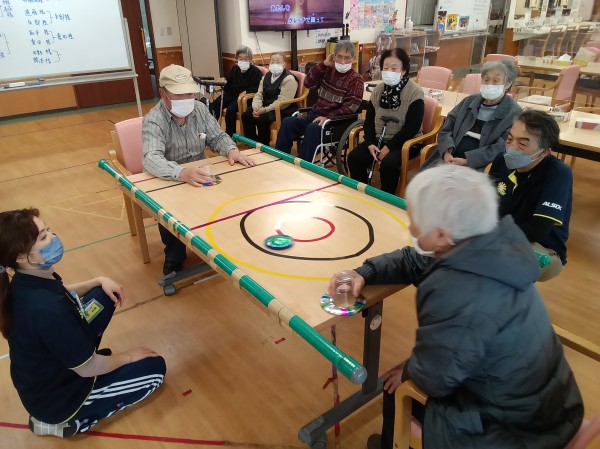 テーブルに座って、ホッケーのパックを相手側に落とすゲームでした。