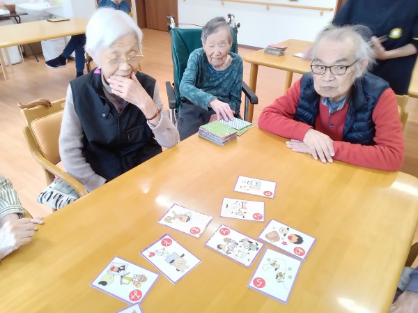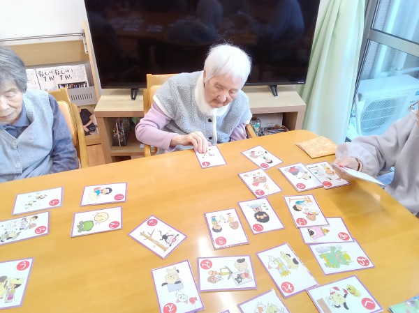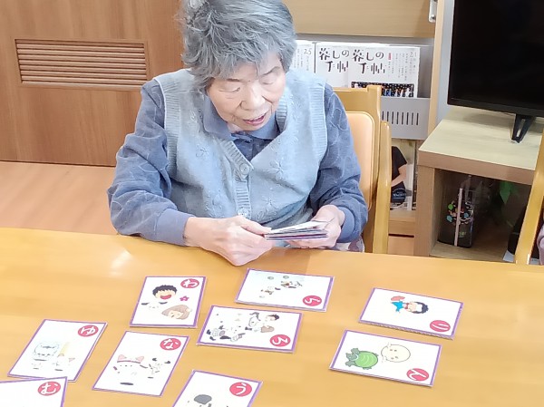 手作りカルタで遊んでいるご様子です( ^ω^)・・・ あった! あったわ!とはしゃいでおられました(*^_^*)