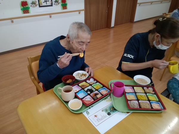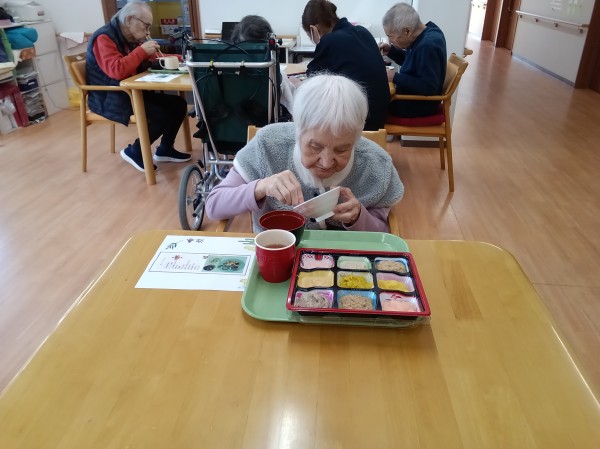 1月1日 お正月・おせち料理を召し上がっているご様子です( ^ω^)・・・ あら~! おせち料理をご馳走してくれるの? 嬉しいわ! と喜ばれていました(*^_^*) 伊達巻や栗きんとんや12種類とちらし寿司のおせち料理をご用意しました。美味しい美味しいと仰られました(*´ω`*) みなさま完食しました。