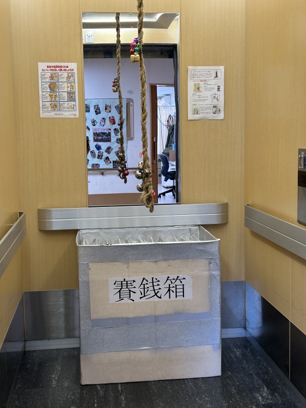 そしてエレベーターの中には鈴と賽銭箱だってあるんです(笑)