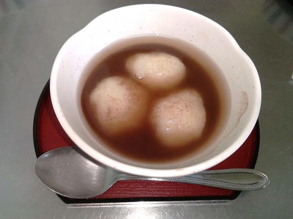 きれいに丸まった”なんちゃってお餅”を汁に入れたら、皆様と一緒に作ったおしるこ、完成!!