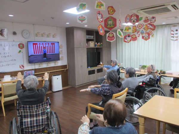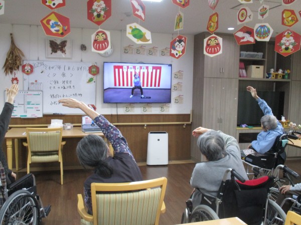 インストラクターと全事業所の入居者様が、リモートで一緒に運動をしています。