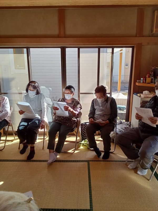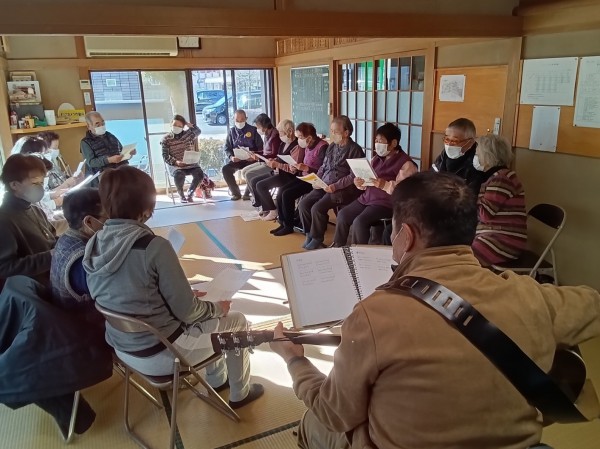今回も、グループホームの職員による歌に合わせての体操で身体をほぐした後、ボランティアの方によるギター演奏に合わせ懐かしの歌謡曲をみんなで唄い楽しい時間を過ごしました。