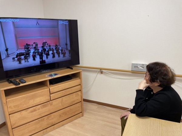 4月に来設して下さることが決まっているオーケストラさんのDVDを熱心に見ているご婦人。自身もコーラスなど精力的にボランティアを行って来たそうです。