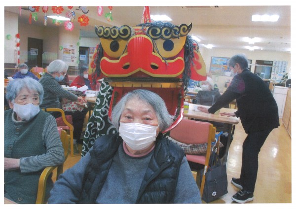 獅子舞では、獅子に頭を噛んでもらって健康祈願、今年も健康に過ごせることを職員も願っています。