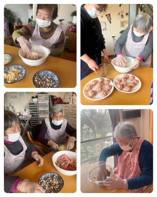 豚ひき肉・椎茸・たけのこ・たまねぎ・調味料を、よくこねて丸めておきます。