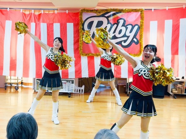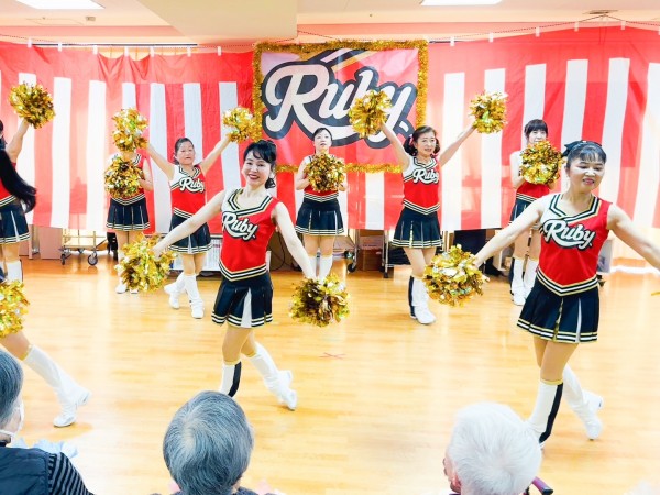 埼玉県久喜市を拠点に活動するチアダンスチームRuby。 各地の様々なイベント出演やボランティア活動を通じて、埼玉県を明るく元気に盛り上げるための活動を行っている素敵なチームです。プロフェッショナルなパフォーマンスに、職員、ご利用者様の皆様も大感激!圧巻のパフォーマンスを披露してくださいました。