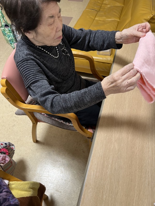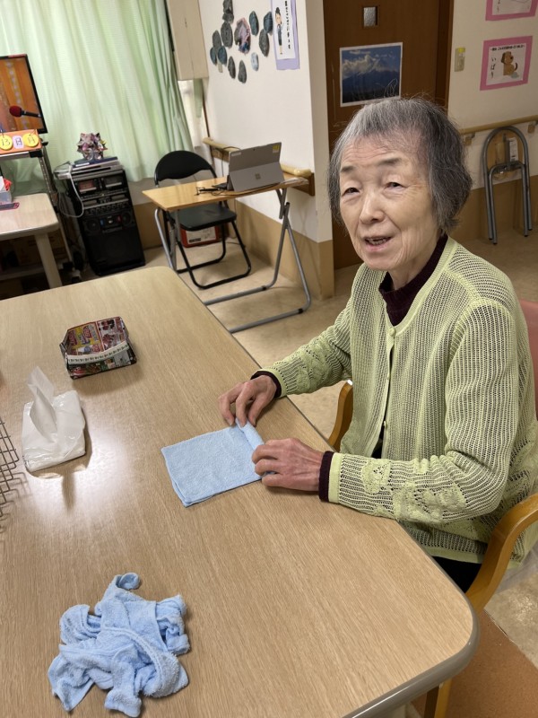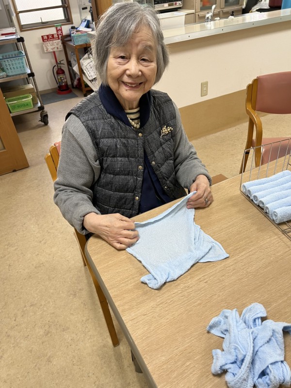 今回は2階にて、おしぼり巻きや洗濯物たたみのお手伝いをしていただきましたのでその様子をご覧ください。