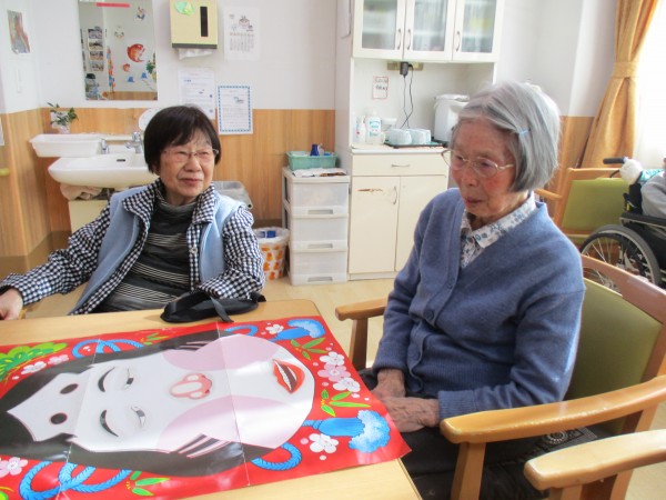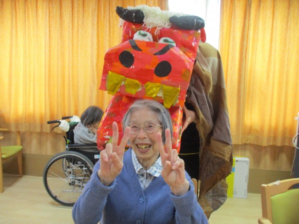 ホームに帰ってからは、甘酒を飲んだり、福笑いをしたり、獅子舞に齧ってもらったり…
