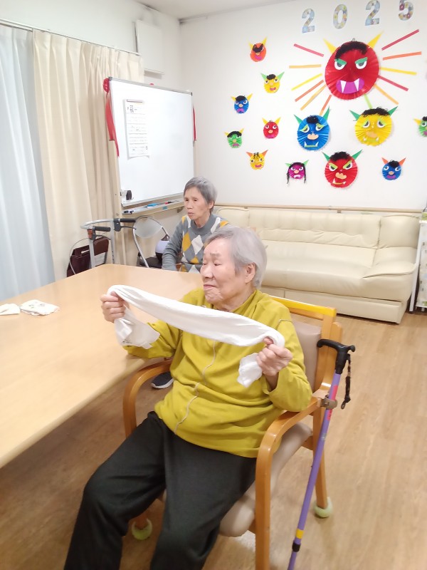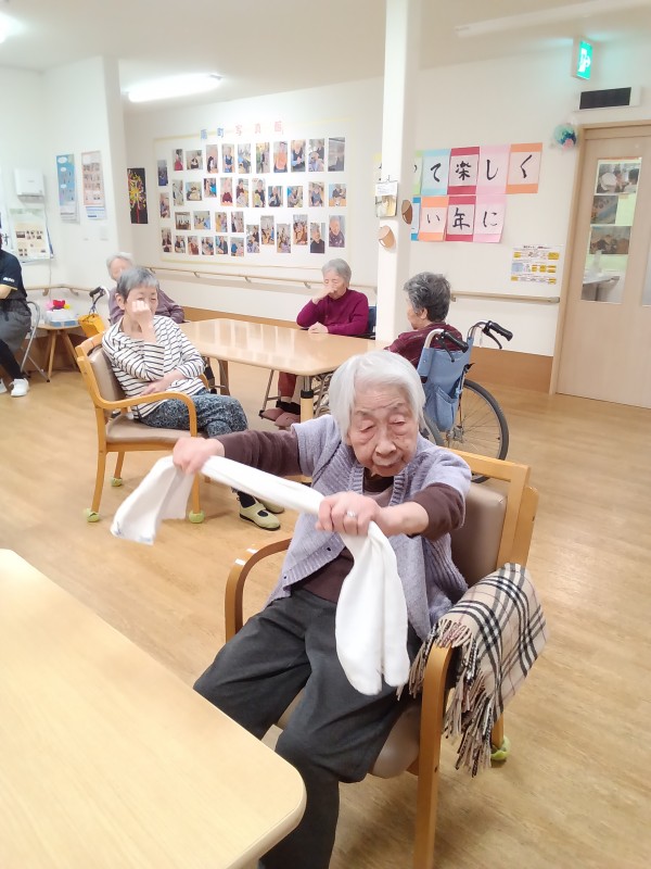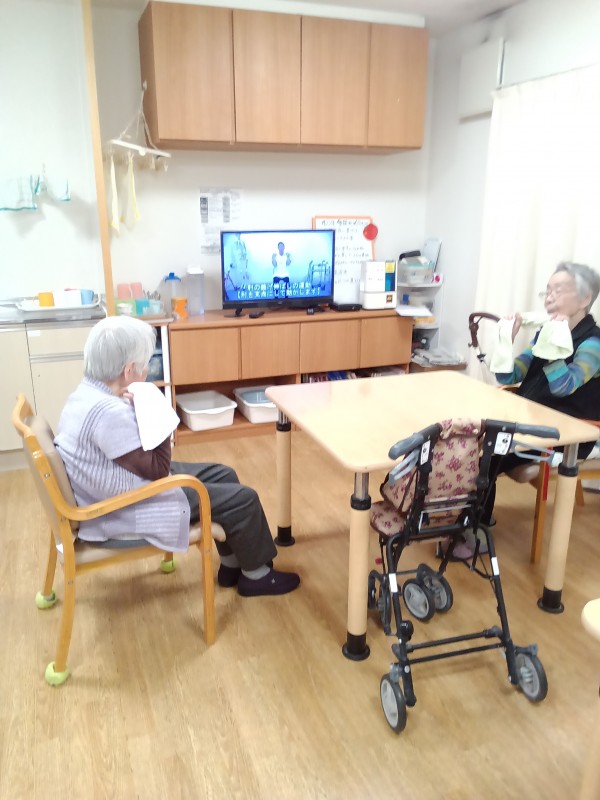 皆さん、ビデオを見ながらタオル体操張り切っていますよ。