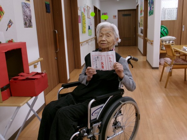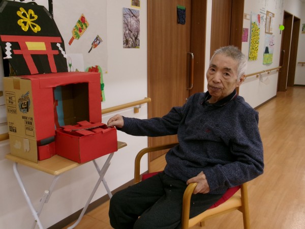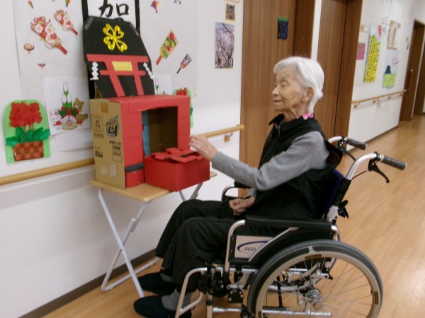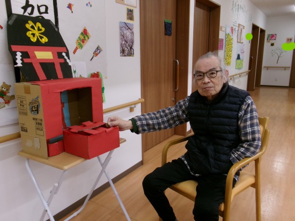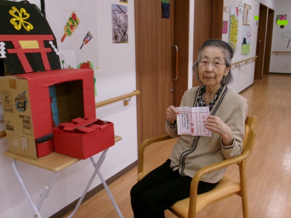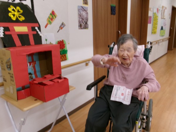 小さな神社を作りお参りしました。健康でいいことがありますように!とみんなでお参りしました!(^^)! おみくじを引かれ「大吉だって? 小吉だわ!」と楽しんでおられました(*^_^*) 楽しまれたひと時でした( ^)o(^ )