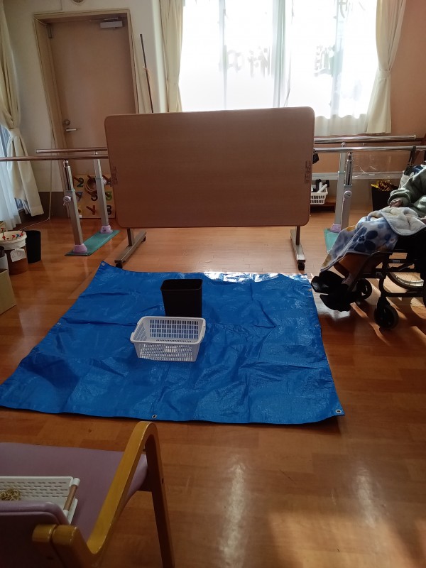 青いシート、白い箱、奥の入れ物に点数をそれぞれつけています。