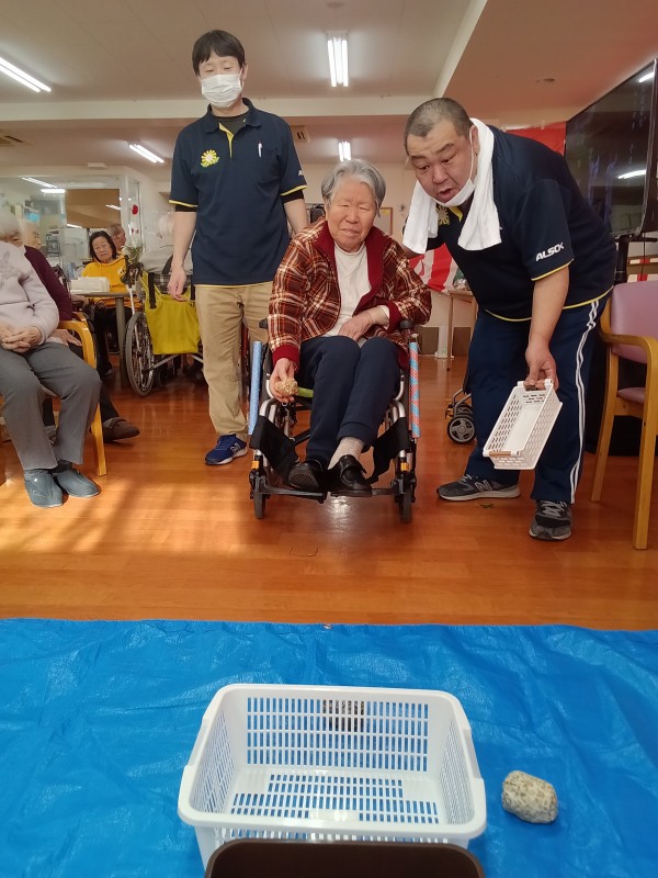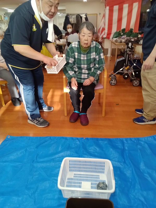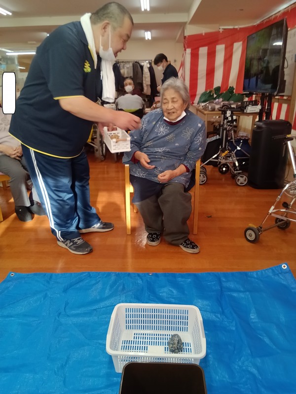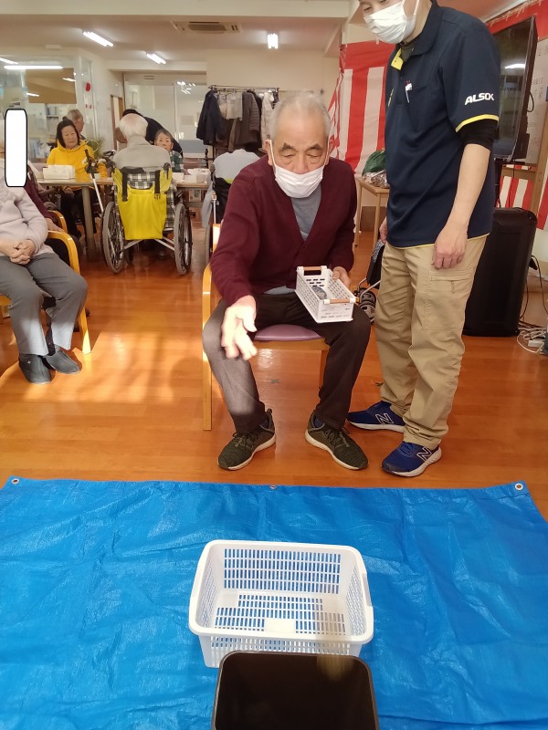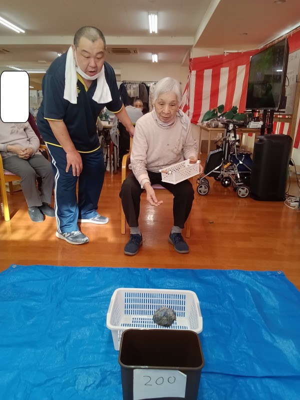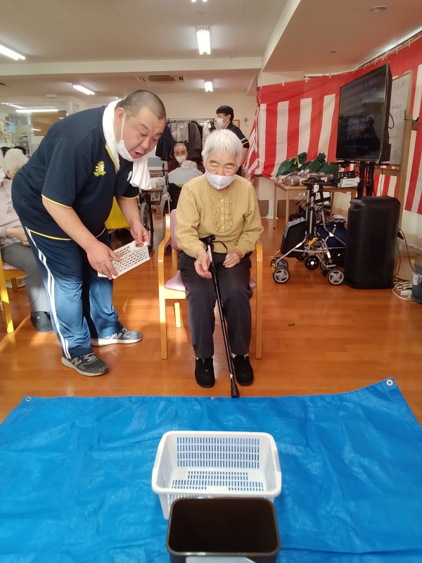 1人3球お手玉を投げて、合計点で景品を貰う順番を決めています。