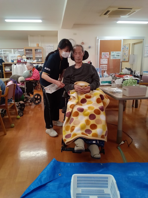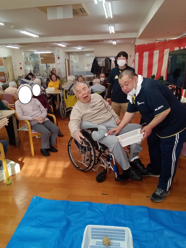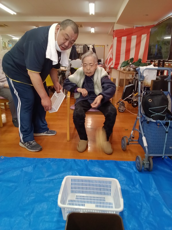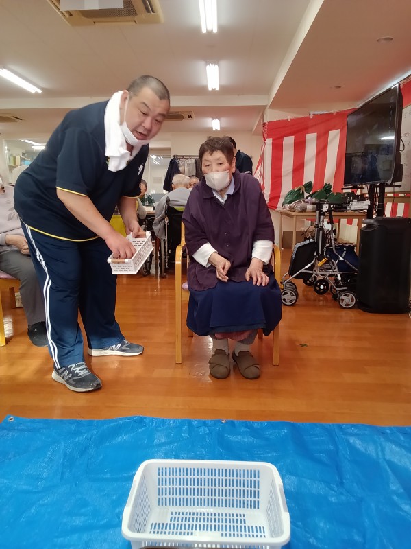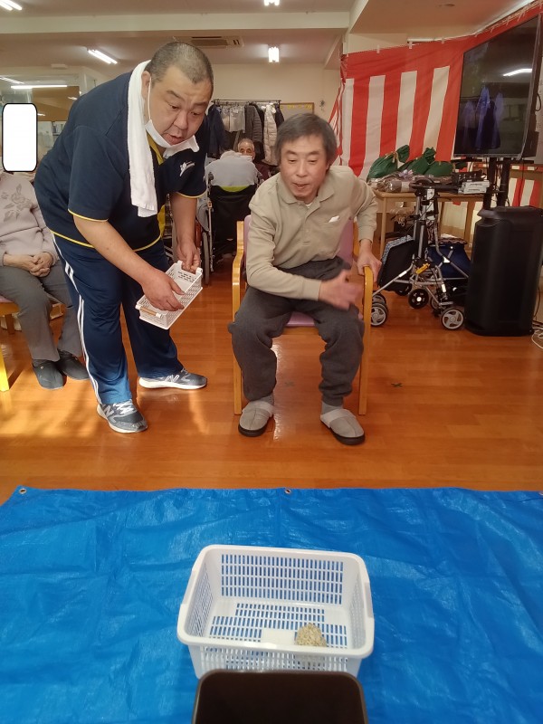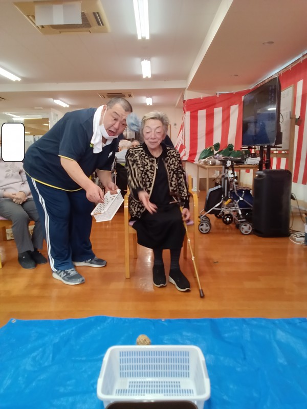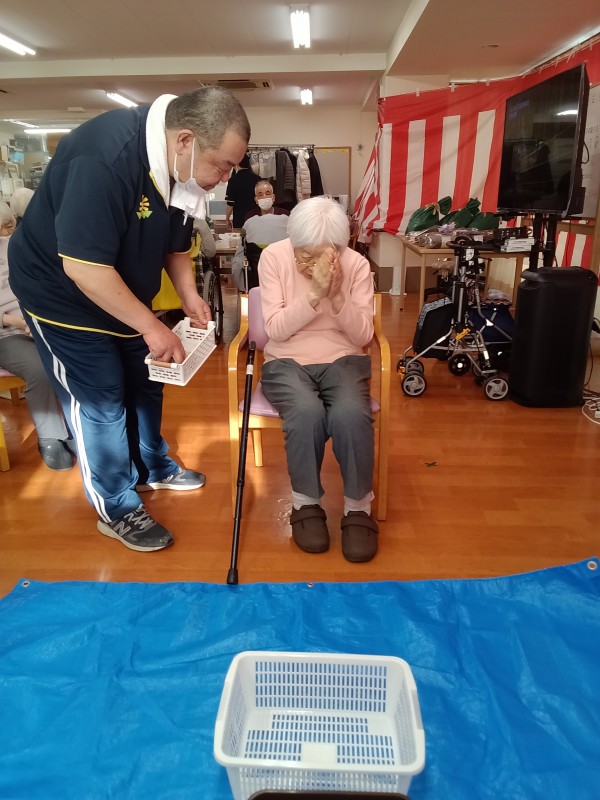 1人3球お手玉を投げて、合計点で景品を貰う順番を決めています。