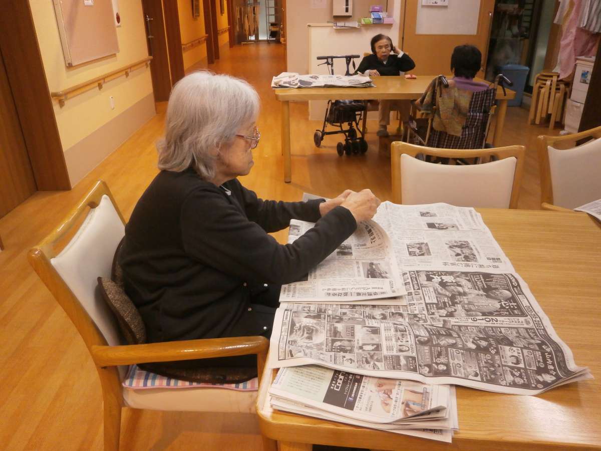 お部屋でおとなしく新聞たたみ。